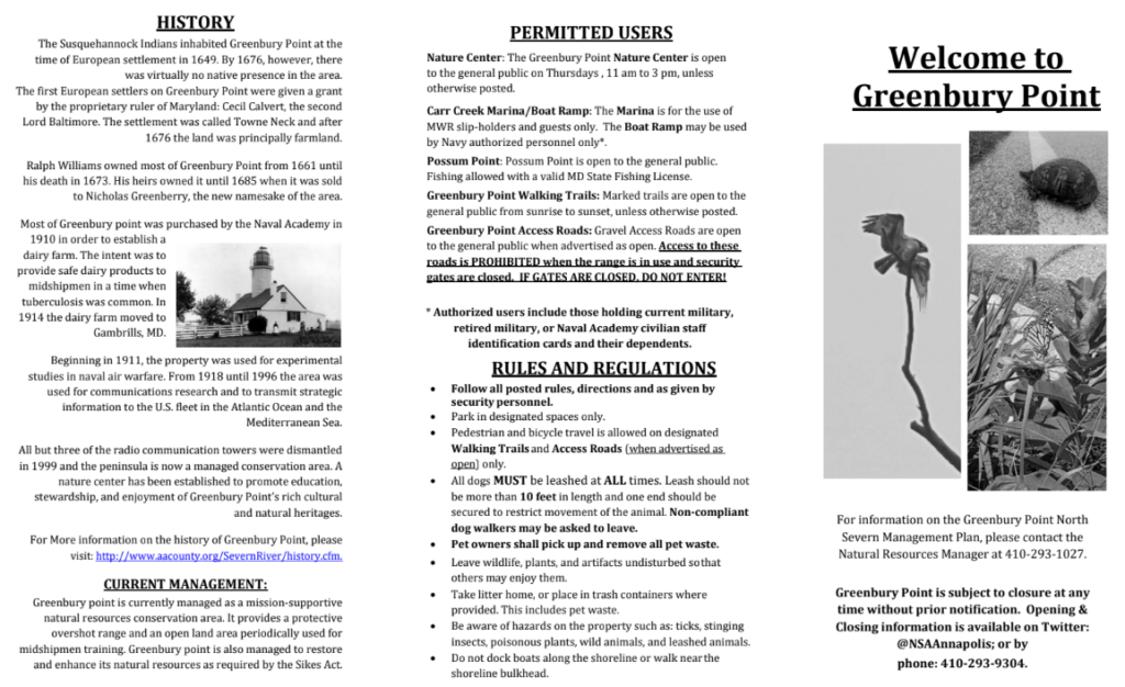 The Greenbury Point Nature Center displays exhibits showcasing the natural and cultural history of Greenbury Point Conservation Area. It is open to the general public on Thursdays, 11 am to 3 pm, unless otherwise posted. Occasionally the restrooms are open to the public at other times.
